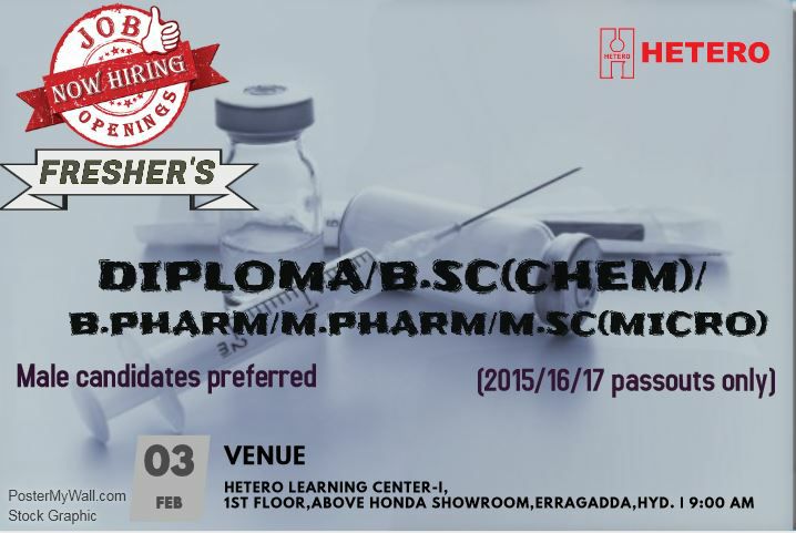 Hetero - Fresher - B.Pharm, M.Pharm - Walk In Interview - 3 February 2018