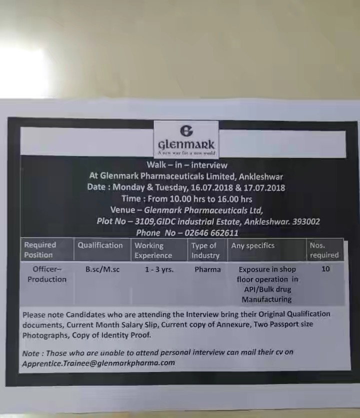 Glenmark Pharmaceutical Walk-In Interview - B.Sc/M.Sc on 16-17 July 2018